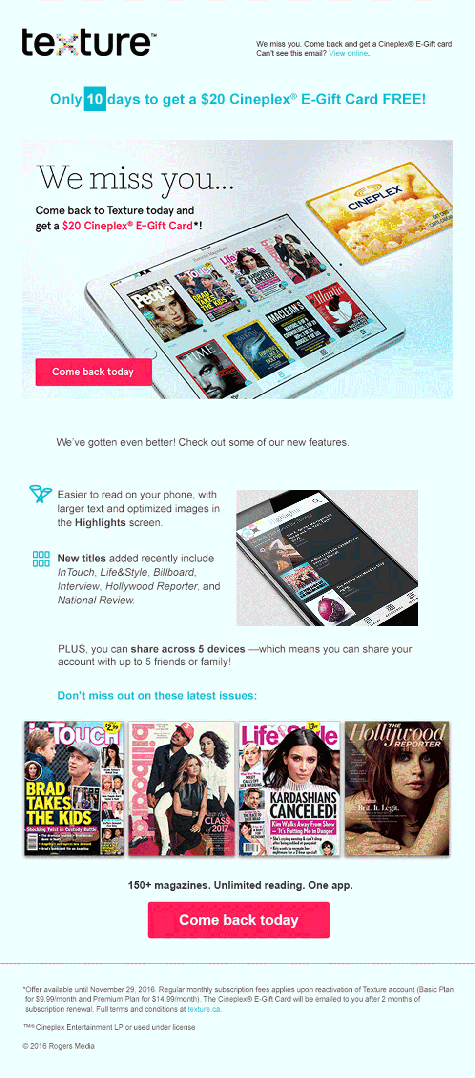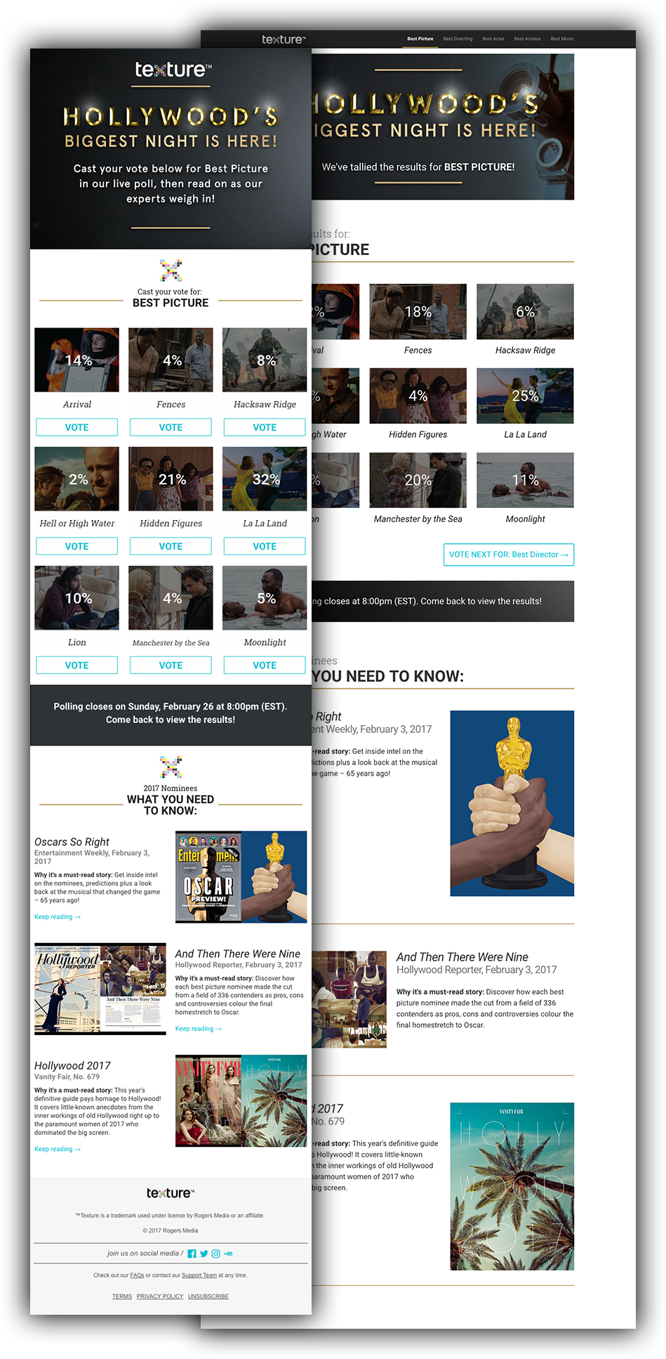 Engagement emails were sent to subscribers, asking them to vote for the 2017 Best Picture during The Oscars. The voting percentage in the email was connected dynamically to the landing page, where users could vote in more categories or read excerpts from magazines covering the event. This was a simple yet effective method of presenting Texture’s content in an interactive way.