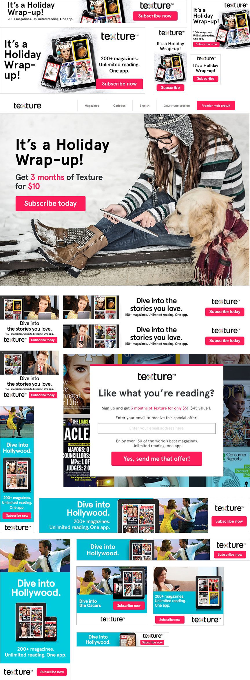 As a freelancer, I was hired during the Fall/Winter season as the designer responsible for a vast amount of digital assets that required continuous customization and development. By keeping campaigns consistent and fresh, we were able to establish a strong customer base for Texture that appealed to larger entities as an acquisition worth obtaining.